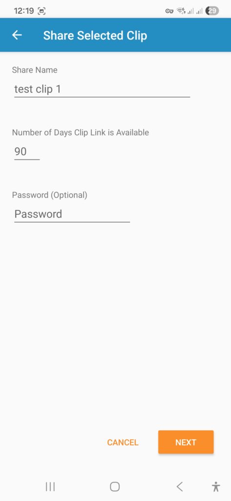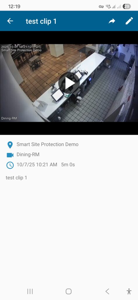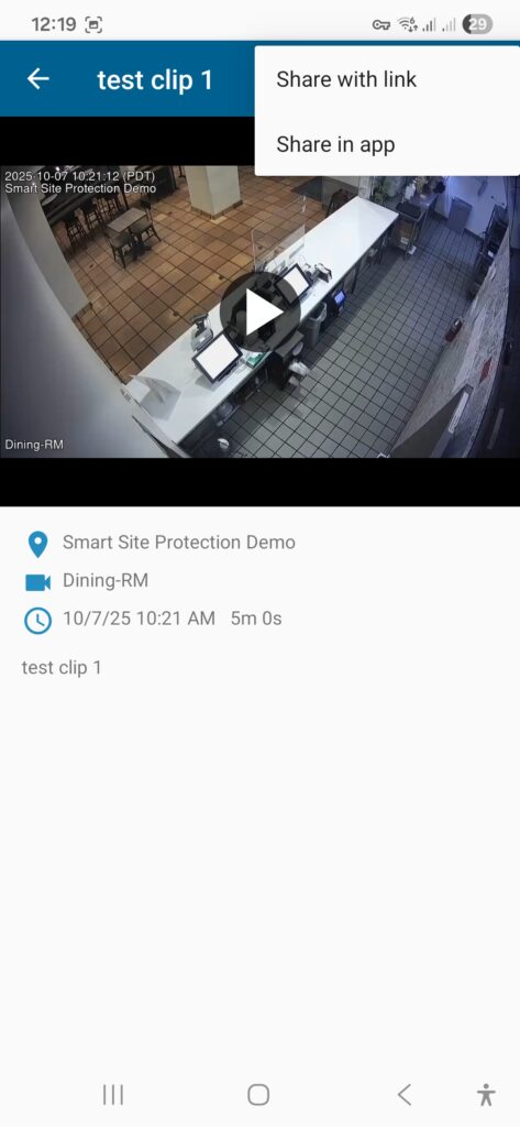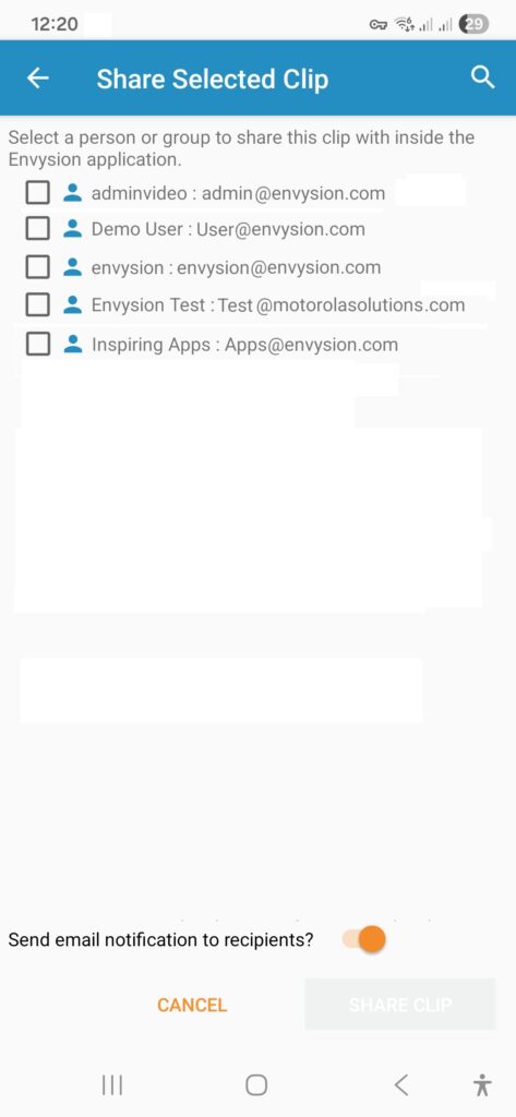 When you have a clip of footage from a site that needs to be shared with another Envysion user in your domain, or with an external party (such as the police or a lawyer), you can share the clip directly from the Envysion Mobile app.