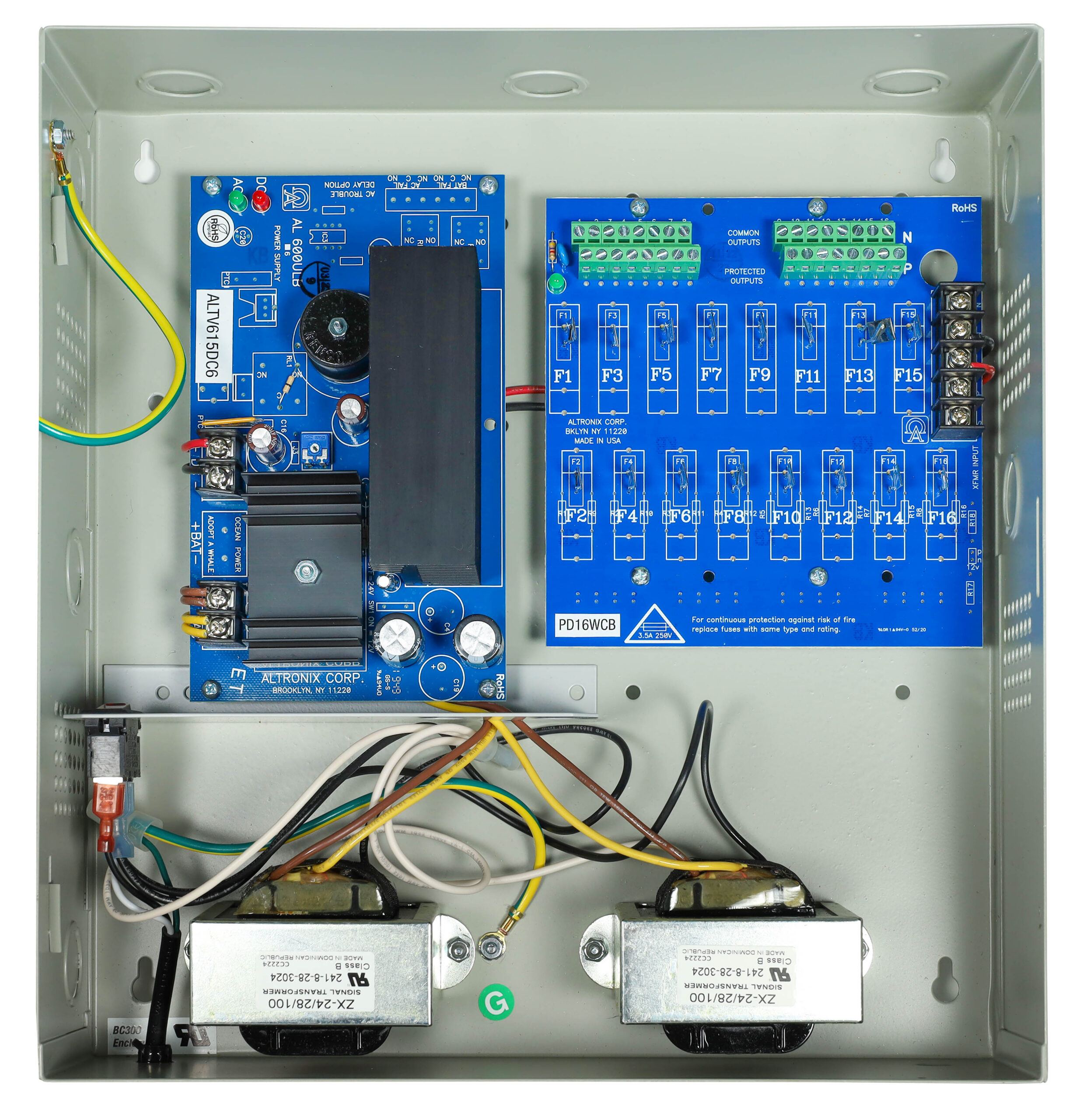 The analog camera power supply unit we provide can be identified by looking for a gray/beige colored box. It will often have the brand ‘Altronix’ printed on the box.