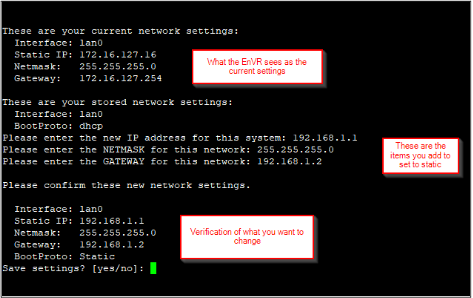 Once IP information is entered, confirm correct, type “yes” and press <Enter> to save the settings.