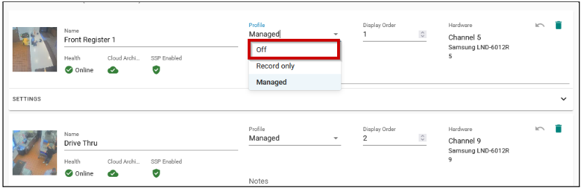 If you need to change a camera from off to Managed or record only it is the same steps in reverse. Hit save on the top right of the page.