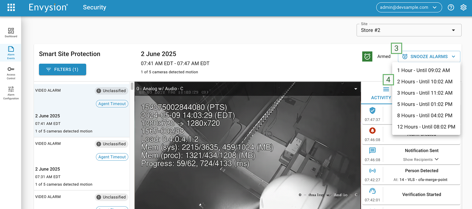 After selecting your desired site, you’ll arrive at the Alarm Events page. Here, you’ll find the SNOOZE ALARMS button (3) in the top right corner, above the Activity log. Clicking it reveals a dropdown with six preset snooze durations: 1, 2, 3, 5, 8, and 12 hours (4). The snooze period begins immediately upon your selection. Your site will automatically re-arm once the chosen time expires, or you can manually turn off the snooze at any point.