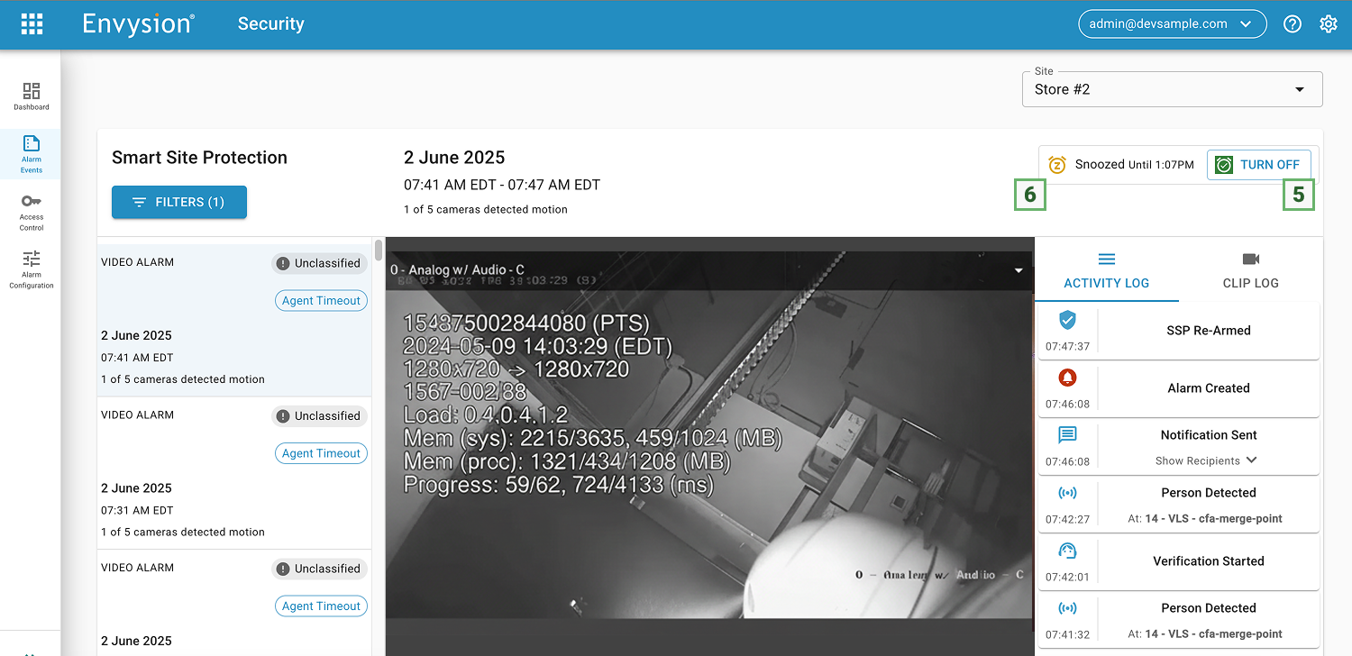 After you’ve chosen a snooze duration, the button will update to “Turn Off” (5) so that you can turn off the snooze and rearm your site anytime you need. Next to it, you’ll see the precise time SSP will automatically re-arm (6). While snoozed, the system will continue to record all motion events, but it will not generate new alarms or send notifications to monitoring agents.
